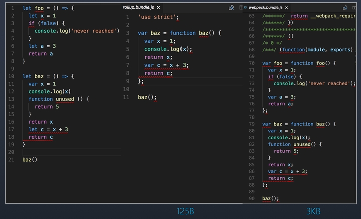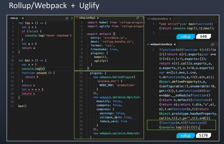 这个特点,是Rollup最初推出时的一大特点。Rollup通过对代码的静态分析,分析出冗余代码,在最终的打包文件中将这些冗余代码删除掉,进一步缩小代码体积。这是目前大部分构建工具所不具备的特点
